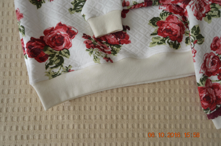 Низ у взрослого свитшота ничем не украшен, отстрочен двойной иглой.