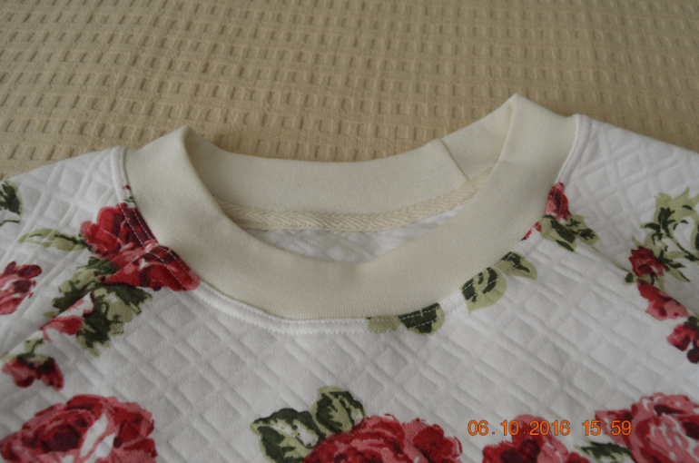 На горловине взрослого шов прикрыт киперной лентой. Шов стыка обтачки сместила относительно центра.