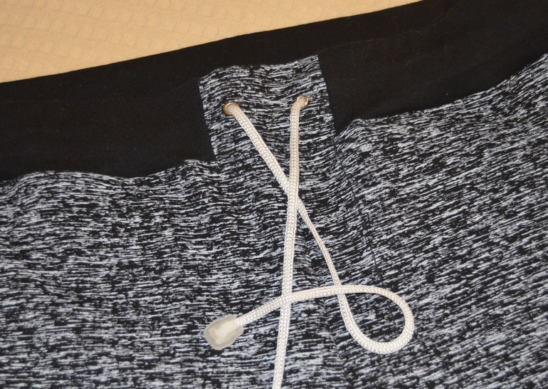 Для люверсов брала кусочек футера, укрепила с изнанки флизелином. В пояс вставила шнурок и резинку широкую.