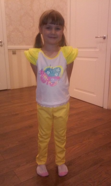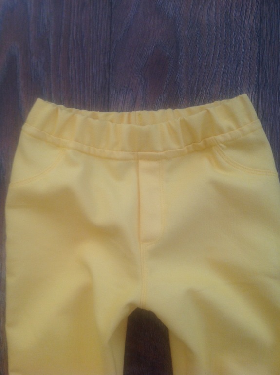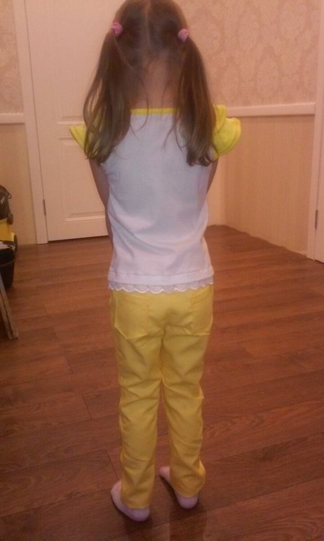 маечка из кулирки, на отделке рибана, по низу кружево (выкройка коротковата оказалась) на рост 116, оттобре 2012/3, джинсы с ложным гульфиком и пояс на резинке из желтой джинсы летней, рост 116, оттобре 2015/4, посадка мне не понравилась,