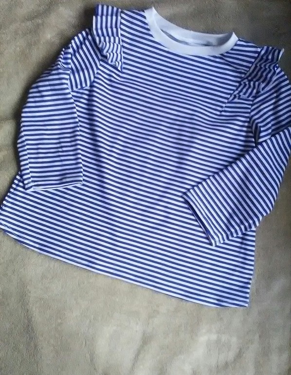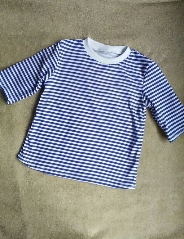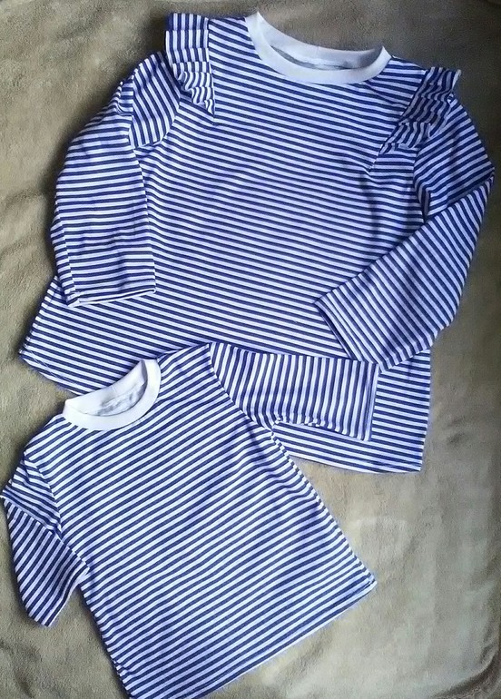 Полосатый комплект из кулирки. Сыну майку обвела, свою шила по увеличенной выкройке детской туники. разрез под рюши сместила вперед. Сидит отлично, но фасончик детский