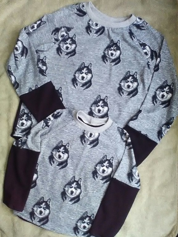 50 см хватило на 2 свитшота (перед и спинка принт), 2 шапки и солоху. Пара обрезков осталась на аппликацию. Сшито все полностью на машинке, горловина закрыта бейкой