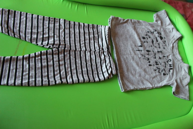 3. комплект из футболки с леггинсами, сшит из моих 2=х видавших виды футболок, шила не задумываясь, а получился комплект )))