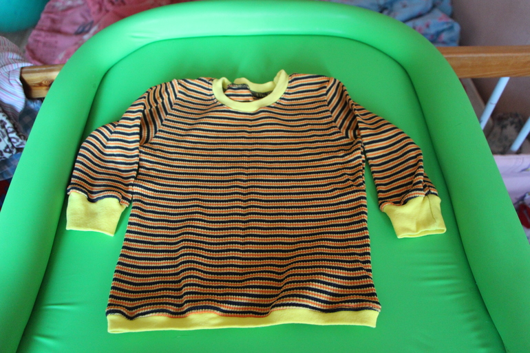 1. Очень долго у меня лежала верхняя часть от пижамы из футера с начесом, мягкая, нежная и совершенно неношенная, откуда она у меня взялась. не имею понятия, потому как я пижам не ношу от слова совсем, а она еще и чуть маловата, ну и дождалась она своего часа, получилась пижамка для младшенькой немного навырост, как раз летом и осенью у нас часто бывает дома сыро, холодно и промозгло