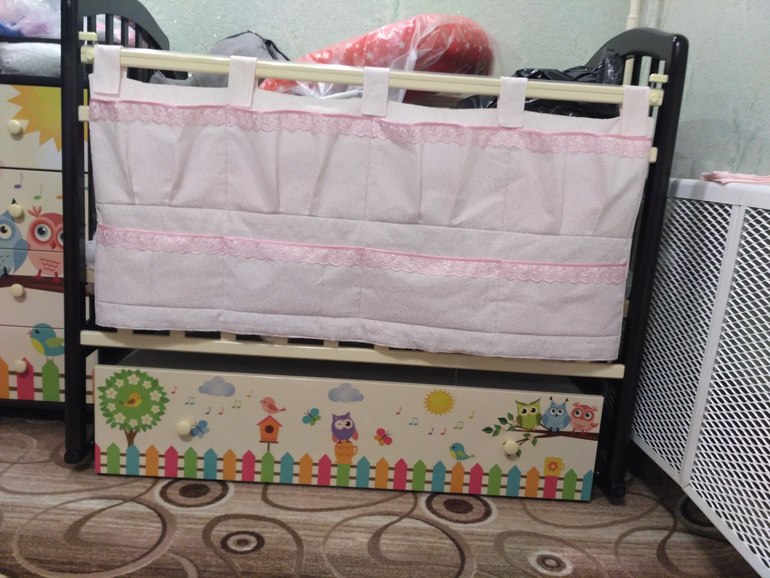 Новичкам. Мои первые работыНачала шить совсем недавно, сначала тренировалась на постельном белье, а теперь взялась посерьёзнее) В органайзере  для кроватки нижний край ещё не обработан, прикинулась примерить.