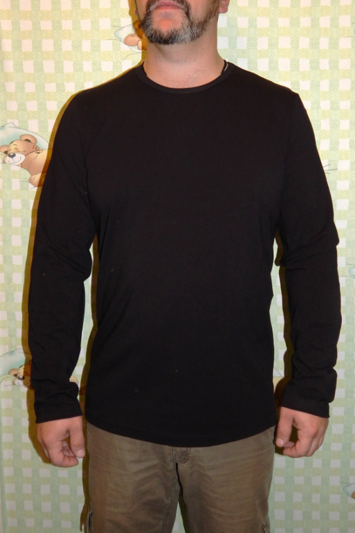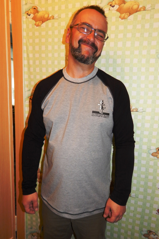 Второй лонг с рукавом реглан. Сделала двухцветным нейтральных тонов, на груди термотрансфер. Выкройка: тык. Тоже мною не идентифицированная откуда... Ткань кулирка с лайкрой, на горловине кашкорсе. Размер L, припуски тоже не стала делать. В следующий раз надо будет взять М. Село не плохо. УЖЕ НОСИЛ, не чёрное!!! Моя доволен.