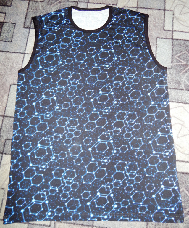 Окрылённая успехом разбавления чёрного гардероба рискнула взять принтованную ткань, сказал что будет носить... Кулирка с лайкрой. Выкройка моя. Носит такие летом обычно, вместо футболок.