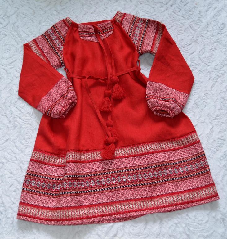 Что касается платья русского, то тут мне сразу вспомнились кусочки льна красного, дожидавшиеся в шкафу своего часа или пока все дети не перерастут тот размер, когда из них еще можно что-то выкроить. Взяла выкройку самую простую с регланом из детской Бурды 2015, мод. 612, р-р 122 ( у Аннушки рост 112 сейчас, в журнале платье по колено, а ей почти в пол получилось, но мне так и надо было). Упразднила карманы, рукава удлинила. Порезала, покрутила, сложила пазл.