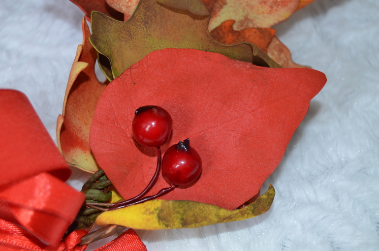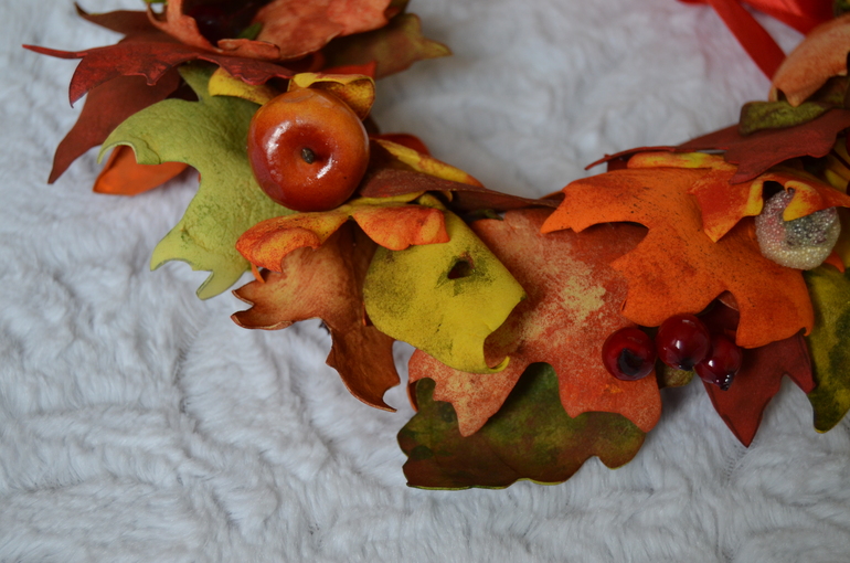 Это фоамиран, тонированный гуашью (не лучшая идея, она пачкает руки потом, но покупать еще и масляные краски меня жаба задавила). Черенки из проволоки, обмотанной тейп-лентой. Основа тоже проволочная. Яблоки и ягодки купила готовые. Очень старалась сделать прожилки, но разглядит их только самый внимательный и дотошный зритель