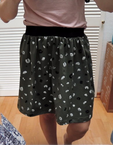 Так как я дома не сижу, захотелось чего-то красивого, гулять с коляской, встречаться с другими мамочками, но время просто крохи остаются от ребенка, поэтому юбки проще не бывает, просто прямоугольник собранный на резинку. Зеленая на полную ширину ткани, 150 см по-моему, синяя сантиметров 130 в ширину ткань. Обе ткани плотный трикотаж, похоже на интерлок, ну и пояс-резинка.
