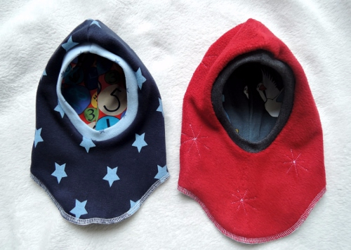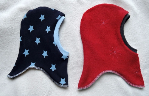 Еще пару шлемов, выкройку давала в этом посте. Размер только один 40-46 см, на нашу 40см голову он большеват, поэтому синий урезала по верху и задней части на 1-1,5 см, сел идеально. Ткань внутри у обеих джерси, снаружи красная флис, синяя толстый флис, наверное поларфлис это, но не уверена. На красной прострочила еще снежинки. Лучше шапок для младенчика еще не встречала, все закрыто от ветра и холода, никакие ушки и помпоны не мешают, когда укладываешь в комбез с капюшоном.