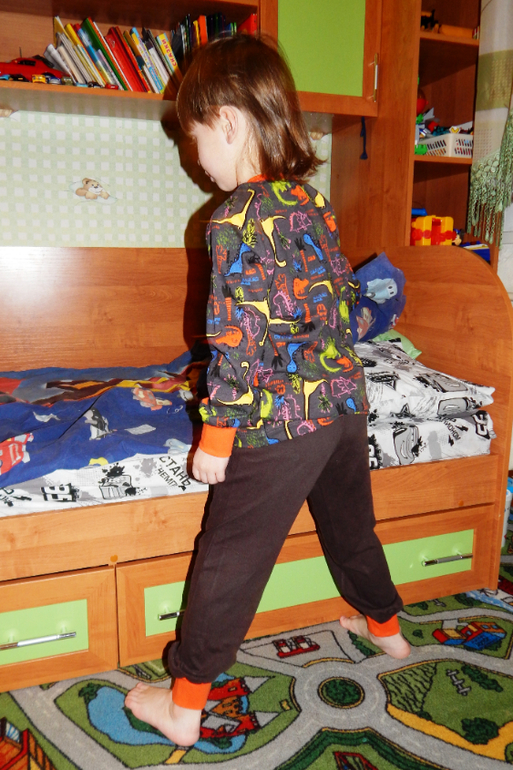 Ну и последняя - кофточка из кулирки х/б. Остались у нас от пижамы штаны, верх мы где-то протеряли (скорее всего на даче забыли). Я их удлинила на манжет, а то стали коротковаты чуть-чуть и сшила к ним новый верх. Выкройка та же.