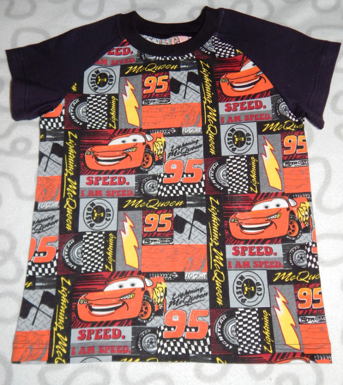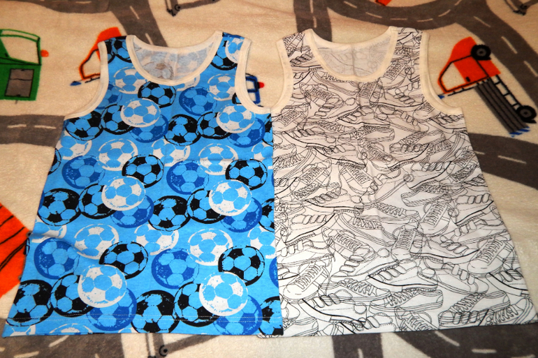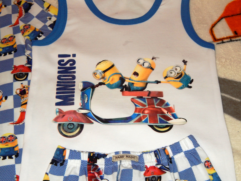 3) Комплект из трех предметов. Футболка по той же выкройке, майка и труселя - выкройка своя. Кулирка с лайкрой. На окантовке рибановая бейка в 3 сложения. На майке термотрансфер. Этот комплект сшила до анорака, но не показывала не хвасталась еще, поэтому вставила сюда.