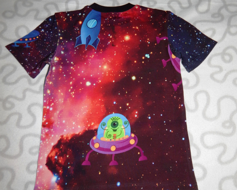 Полочка - сублимационная печать на кулмаксе. Рукава и спинка - кулирка с лайкрой.