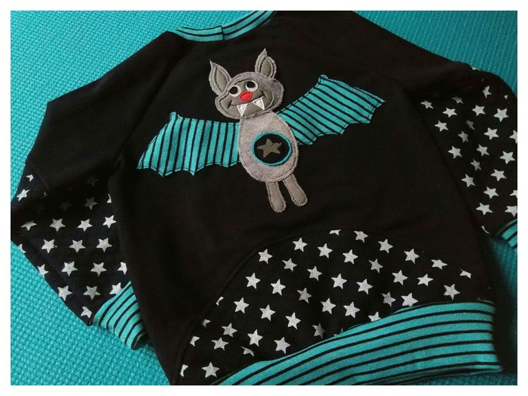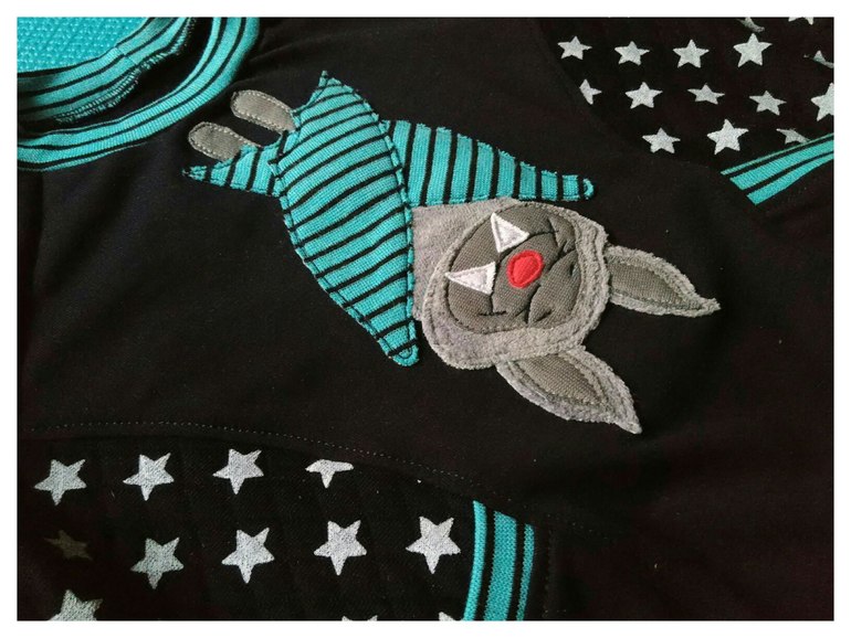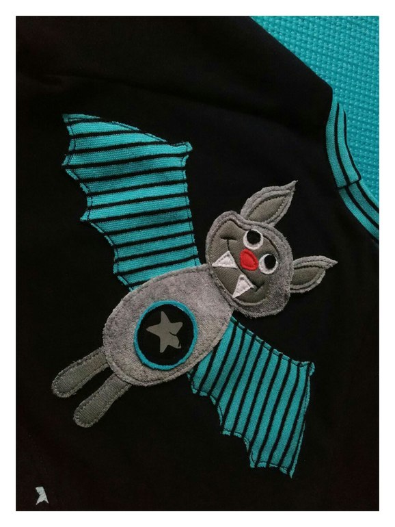 Предыстория такова, что мешки с обрезками стали банально мешать открывать шкаф. Порывшись, отсортировала стопочку лоскутов. Выкройка была из Оттобре, но ни номер журнала, ни номер модели я себе не фиксирую. Выкройку пересняла покромсала-покромсала, чтобы максимально израсходовать лоскуты. Докупить пришлось только светоотражайки. В итоге: "каша из топора". Картинку спящей летучей мыши где-то подсмотрела, она поселилась на полочке.