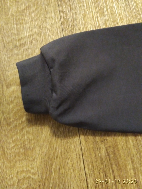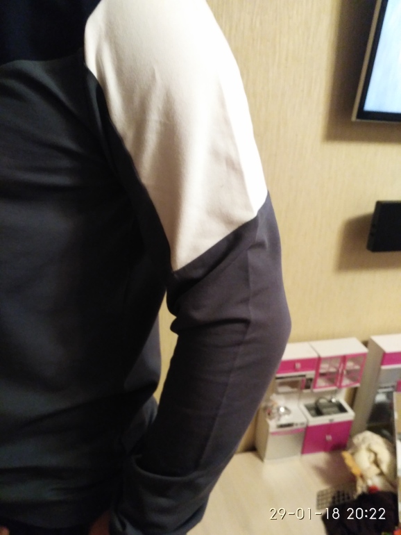 На отделке манжеты из дымчатой рибаны, горловина темно-синяя рибана, шов горловины на спинке закрыла черной кулиркой. Сфотать нормально цвет никак не получалось, со вспышкой вообще перевиралось, еле как удалось. Муж отказался показать своё лицо, но хоть так 😉.