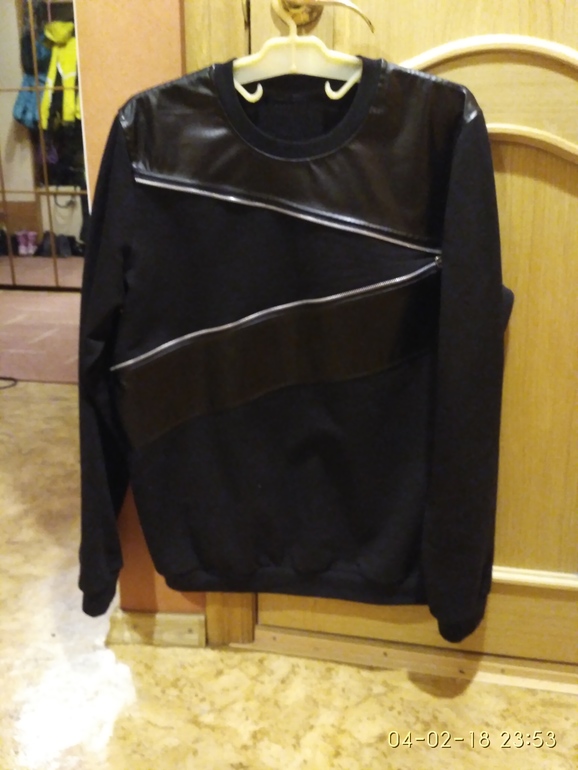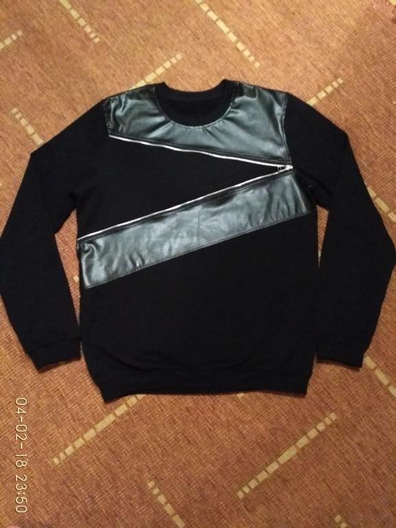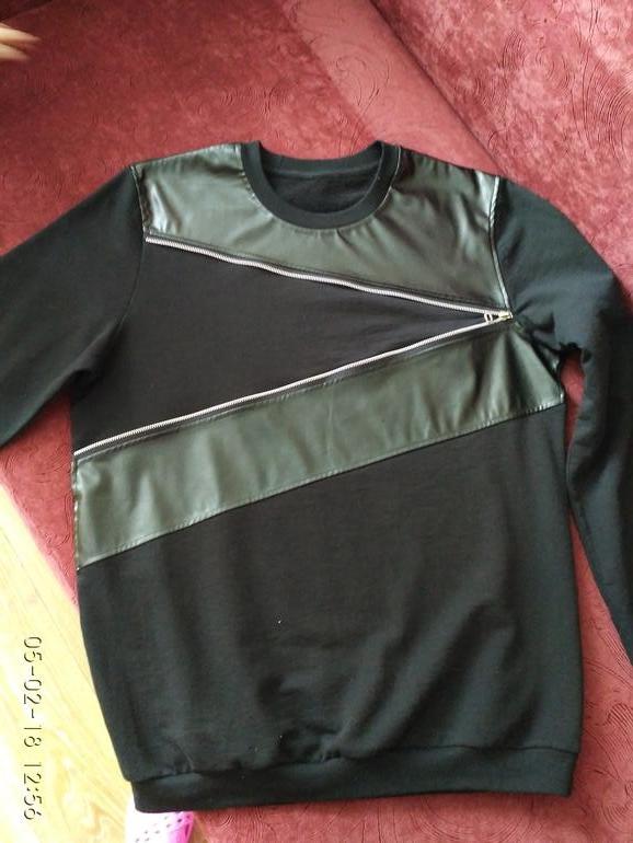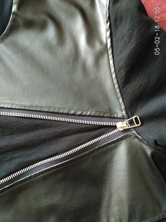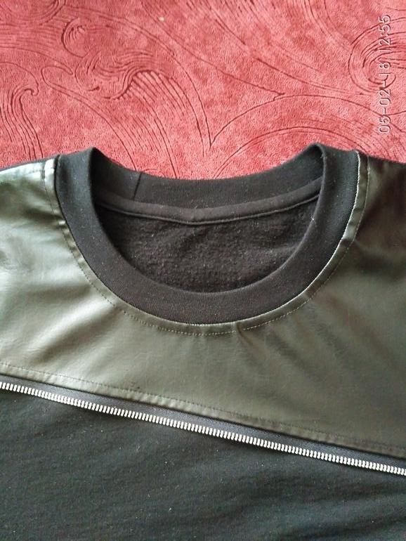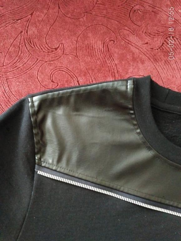 От этого джемпера я вообще в восторге! Ткань черный футер 2-х нитка хб с начесом, кожзам на трикотажной основе, на отделке черная рибана, шов горловины на спинке закрыт черной кулиркой. Молния металлическая. По коже всё отстрочила, чтоб не топорщилось. На фото кожа сильно блестит, в жизни блеск поумеренней, ведь все знают, что черный цвет очень тяжело передать на фото. Молния пошла слегка волной, это я забыла укрепить флизелином срезы, но не критично.