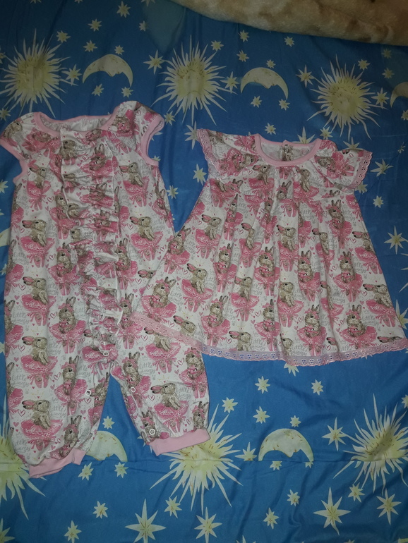 Шьем детямИсходный материал-55 см кулирки х/б с очароватетьными зайками). Выкройки с сайта Шкатулка: комбезика 86 р и платишка 80 р.Вот что получилось