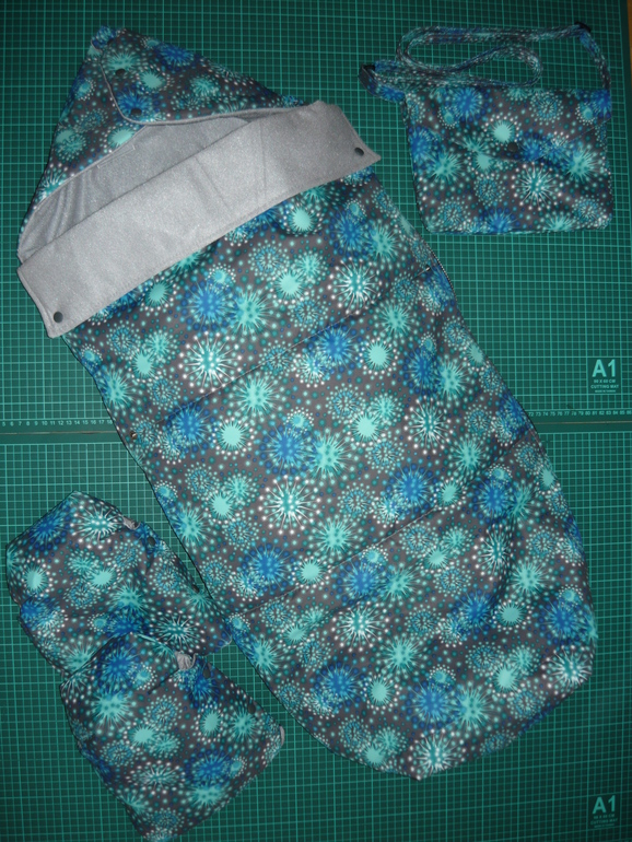 ну и на "закуску" банальнейший набор - конверт, муфты и сумка. китайская типа мембрана, на подкладке "каризма" жемчужно -серая, утепление 100 гр шелтер микро тнр.