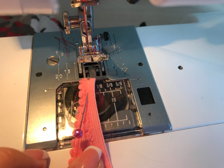 Ложим резинку вниз головой к краю на боковой шов, лицо к лицу, припуски разправляем.