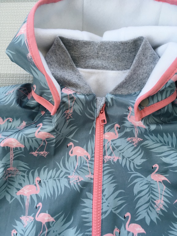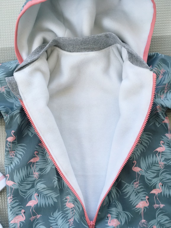 Машинка немного подвела. Почему то отказывалась ровно двигать флис(именно когда флис оказывался внизу). В итоге на отстрочке в местах горловины и молнии неровные стежки🤔