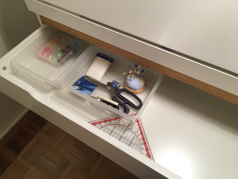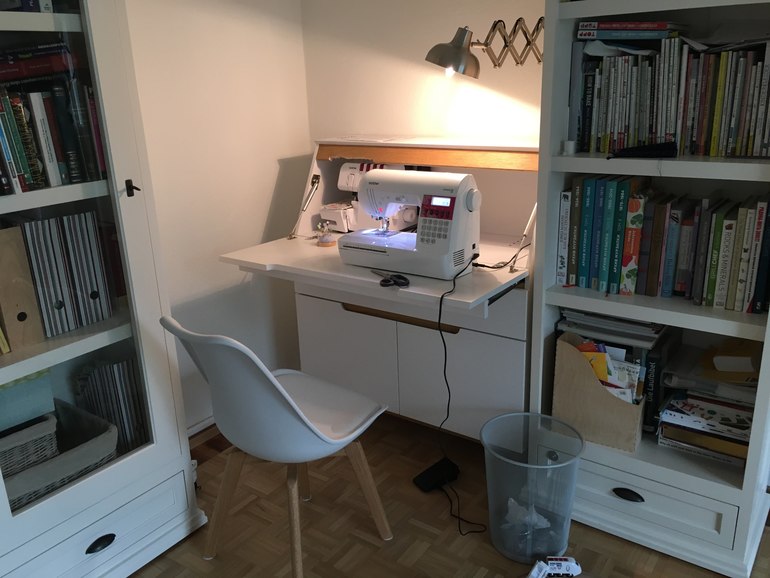 А еще я наконец оборудовала себе новое швейное место в углу гостиной и сразу же ощутила, какая же это красота иметь постоянное место для шитья. Очень жалею теперь, что не решилась на это раньше. Когда всё под рукой и не надо таскать туда-сюда машинку и оверлок после каждого законченного проекта (раньше я шила на обеденном столе и всегда приходилось за собой всё убирать в шкаф, так что пока распакуешь, поставишь машинку или оверлок иногда и желание шить пропадает).