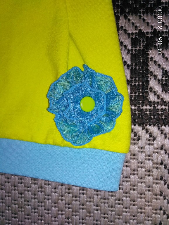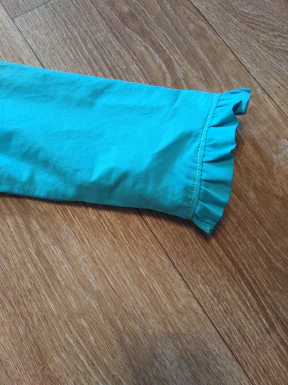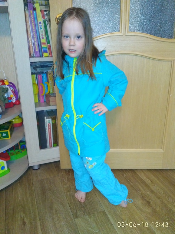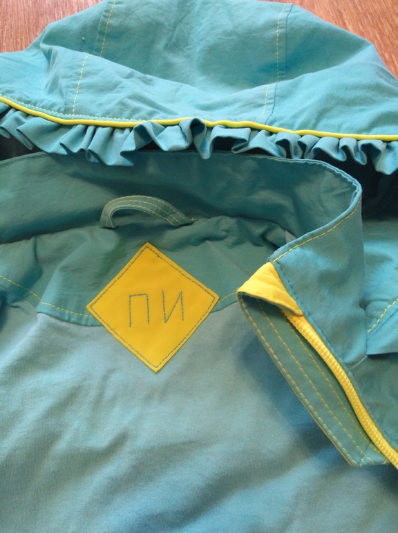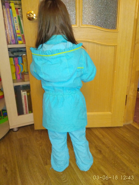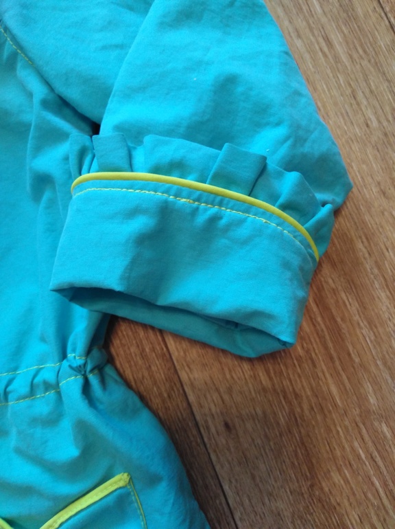 Планируем носить два сезона, для этого сделала ветровку подлинней и рукава с отворотом. Салатовые канты из сорочечной ткани. Внутри подборта, все как положено, кармашки изнутри салатовые. На дочке штаны от прошлогоднего костюма (отдали знакомые), ветровка стала мала, а штаны до сих великоваты, но будем носить, тем более сюда очень подходят.