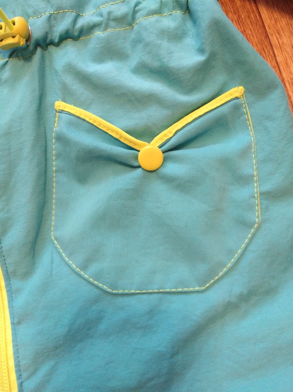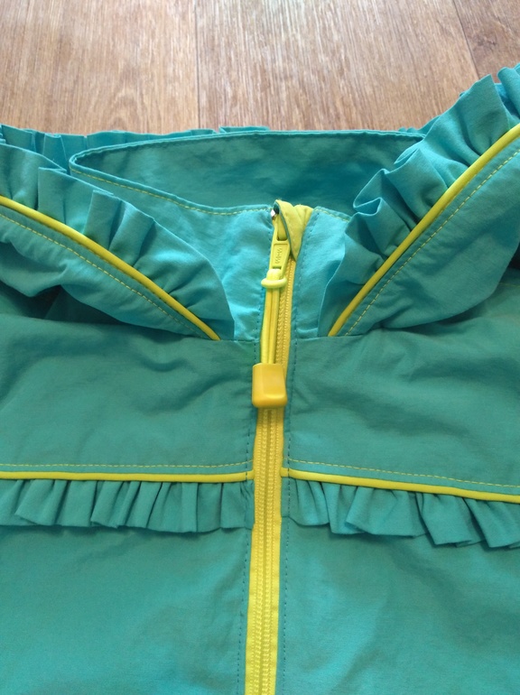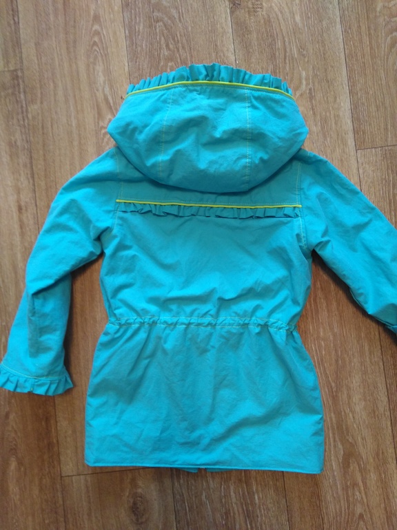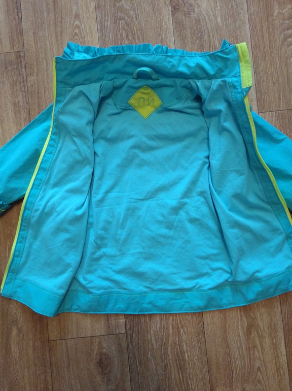 Сшита она из смесовой плащевки с хлопком бирюзового цвета, на подкладке голубая кулирка хб. Эту ткань заказывала себе на плащ, но решила, что будет хлипенько смотреться, а для ветровки в самый раз. Основа из оттобре 2013-1-12, с изменениями.