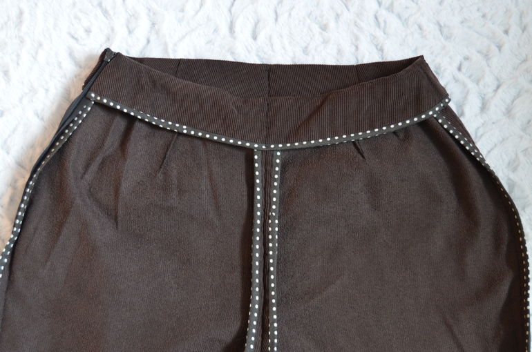 Вторые брюки, кстати выкроены были по той же выкройке, но совсем-совсем без припусков. Это было весьма опрометчиво с моей стороны, но на счастье, я всеж смогла натянуть их на себя. По фоткам видно, что едва ли не трещат))) Ну, значит, он будут служить мне индикатором не хуже весом, показывающим, что дорожку к холодильнику временно забыть следует.