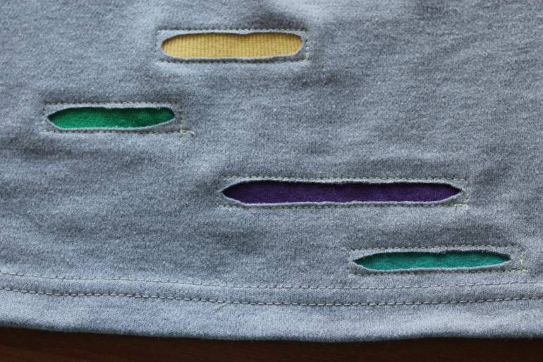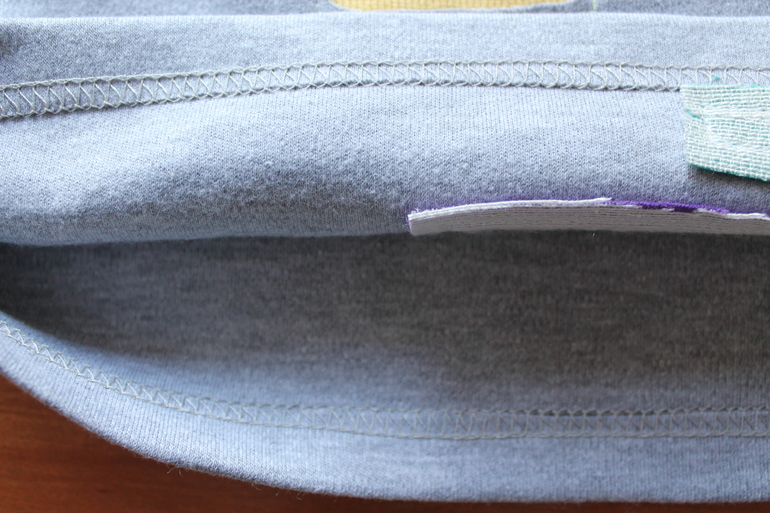 В качестве декора полоски разноцветного трикотажа. Есть вставки из желтого пике и кашкорсе,которое на горловине.