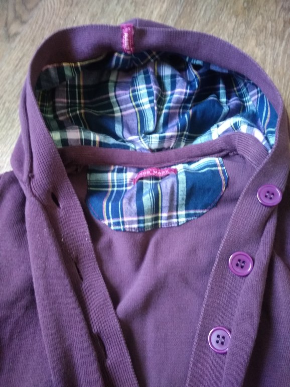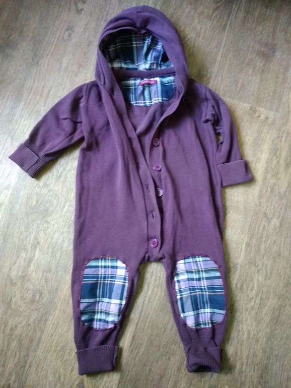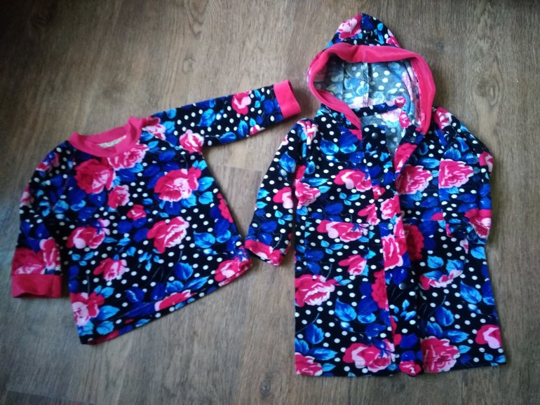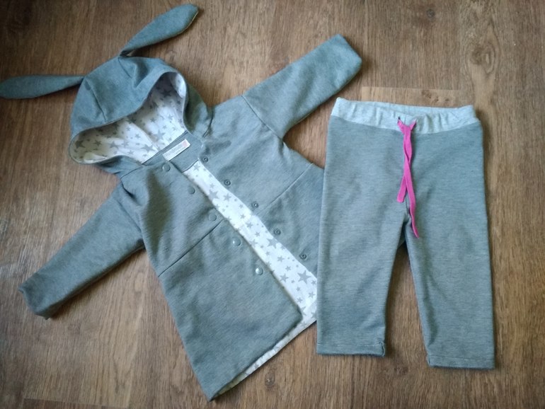 В начале лета сшила толстовочку-пальтишко с ушками, с пластиковыми кнопочками. Из плотного трикотажа, подклад из хлопка со звездочками. Штаны сшила только недавно, так и лежали выкроенные в начале лета)