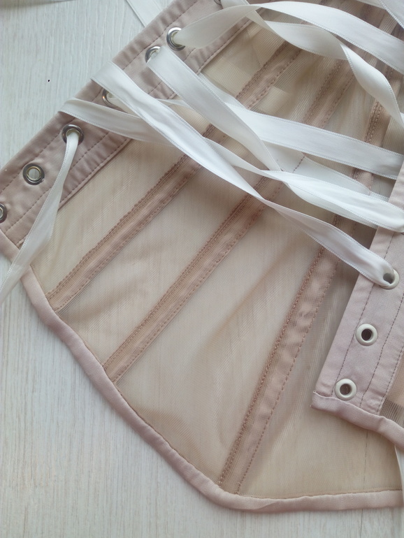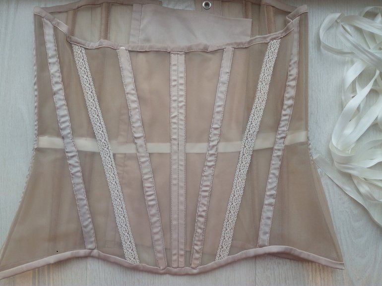 Материалы - корсетная сетка, искусственный шелк, металлические спиральные кости и планшетные стальные по четыре на середину полочки и спинки. На талии сатиновая лента (узковата всё же), для шнуровки она же. Выкройку строила сама, опираясь на Мюллер и сын. Спинка завышена.