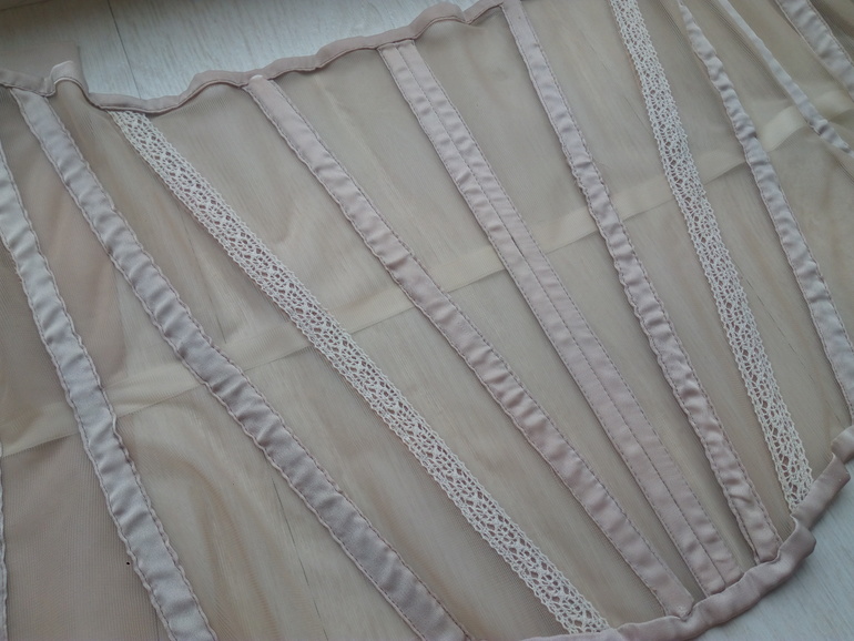 Но есть еще один вопрос, который я до сих пор ищу ответа - кулиски. Когда-то я шила двухслойные корсеты, там все просто - соединяешь два слоя, прострачиваешь, вот и кулиски готовы. А здесь один слой, еще и прозрачный. Как сделать так, чтобы кулиска и с лица и с изнанки была красивой?