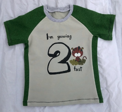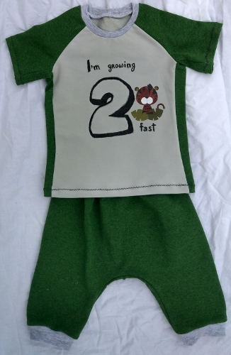 Моему сыночку исполнилось в июле 2 годика, и к празднику я сшила комплект. Тема у нас была джунгли, поэтому травяной зеленый из закромов сам выскочил мне в руки, плюс нейтральный серый. Обе ткани футер петелька, на горловине и манжетах рибана. Надпись сделана специальным маркером для ткани, плюс аппликация тигренок с али.