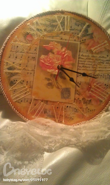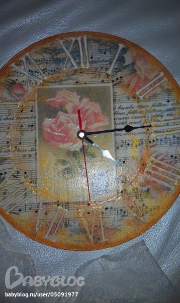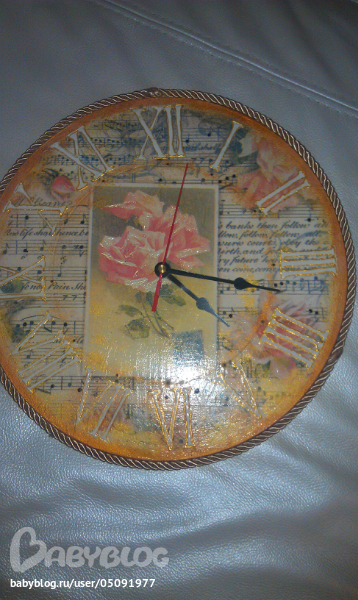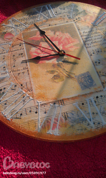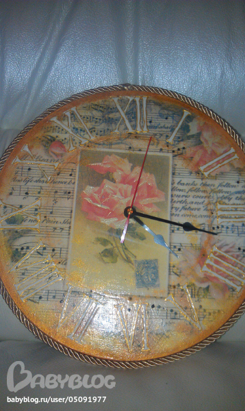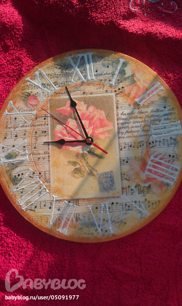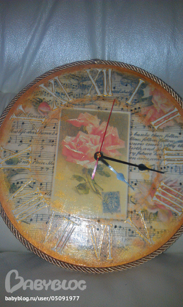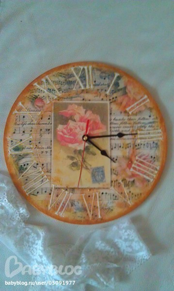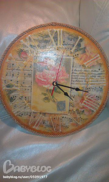 ДекупажЭти часики сделала для своей сестры! Теперь они весят у нее в кабинете.. и поднимают настроение ей и ее клиенткам, она работает косметологом и как я творит красоту своими волшебными руками