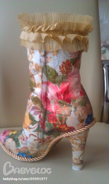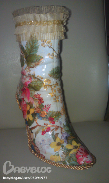 Но на этом все не закончилось она принесла второй сапожок и я пошла другим путем попробовала его задекупажить....