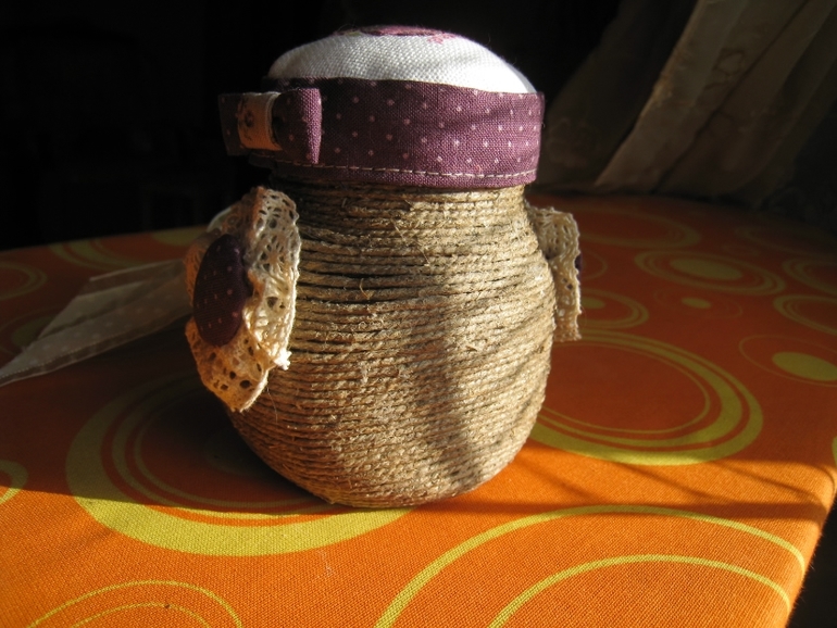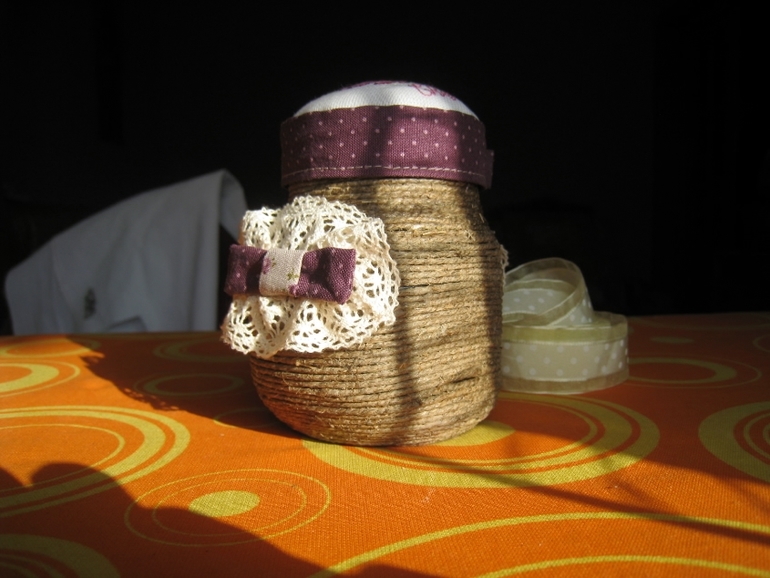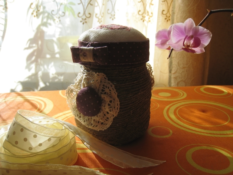 Вот пока для начала сделала баночку игольницу,туда складываю обрезки ниток когда вышиваю очень удобно и иголочка на месте,и хвостики спрятаны.