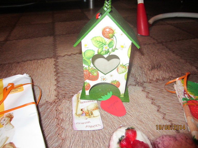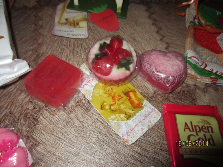 Чайный домик, я давно о нём мечтала.весь в клубничках.и все подарочки были с рукадельными клубничками и подписаны. а какое мыло))) какой запах.тоже сделано ручками Аллы))).сколько вкусняшек. ленточки и пуговки для моего хомяка.нашему папе обалденная книжка про холодное оружие. сыну старшему прикольные стёрки,доче резиночки.малышу кофточку наш размерчик)).вот такая у нас супер посылочка!!!!!!!но и ещё несколько фото