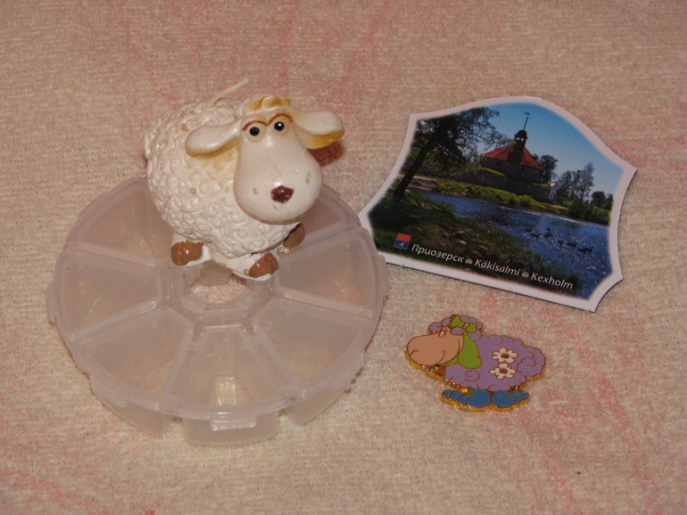 магнитики с городом( уже на холодильнике), свечка-овечка с грустными глазами и коробочка для бисере( их много не бывает!)
