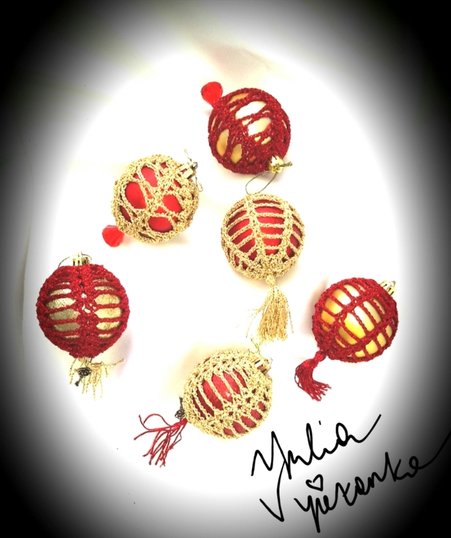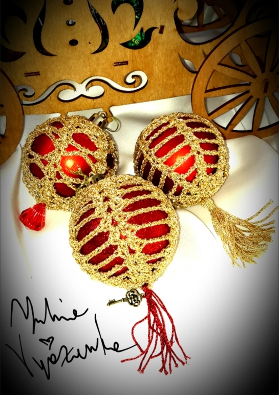 ДекорированиеВ канун Нового года делала последние штрихи в приготовлении подарков для родных. Заключительные аккорд - елочные шары, обвязанные крючком и дополнительно декорированные кристаллами, подвеской под бронзу "ключик от счастья" и кисточками.