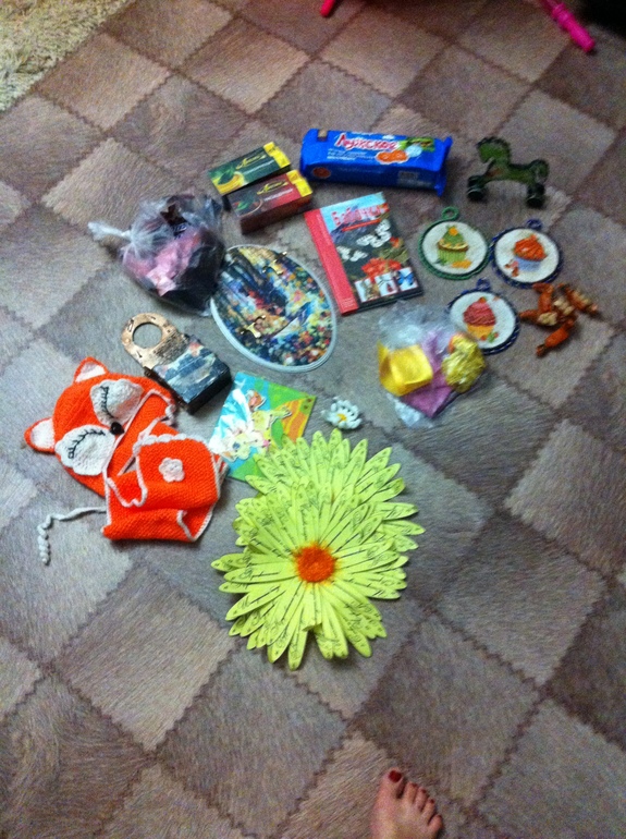 пришли домой и я не успела сфоткать как всё уже осталось без красивущий обёртки.каждый подарочек был упакован.спасибо Танюш)). а вот и общий вид наших сокровищ