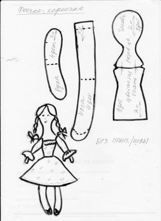 Куколка по выкройке ФЕЕЧКА-КОФЕЕЧКА (из книги, только там была дана выкройка совсем символическая, поэтому пришлось свою плохонькую сделать).Брошь-роза и туфельки -из фетра. Ее я сделала без припусков на швы и она получилась 25 см.Если сделать припуски, то будет немного побольше. прошу прощения за выкройку- делала наспех для себя.