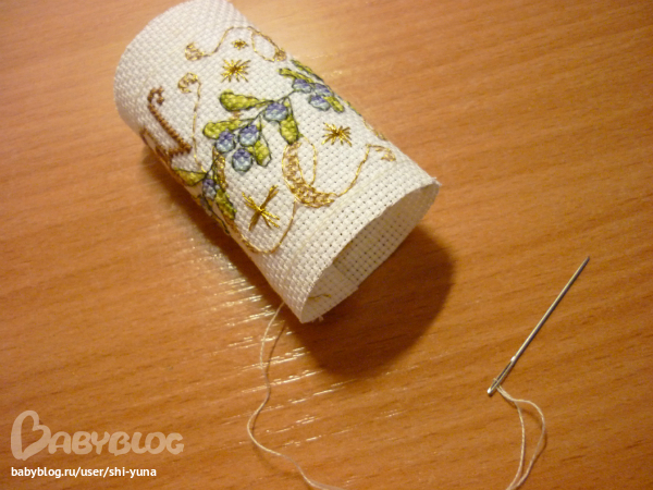 Сначала обшиваем наш прямоугольный узор стежком "назад иголка". Затем складываем короткие стороны вместе и сшиваем их таким же швом, как и бискорню. Желательно шить в одну нитку, так шов будет менее заметен. Получаем что-то в виде трубочки:
