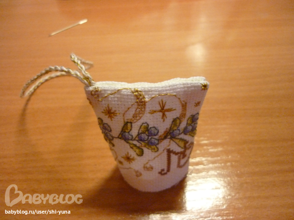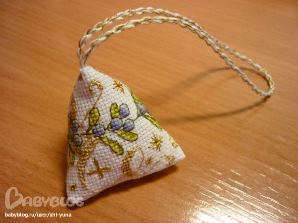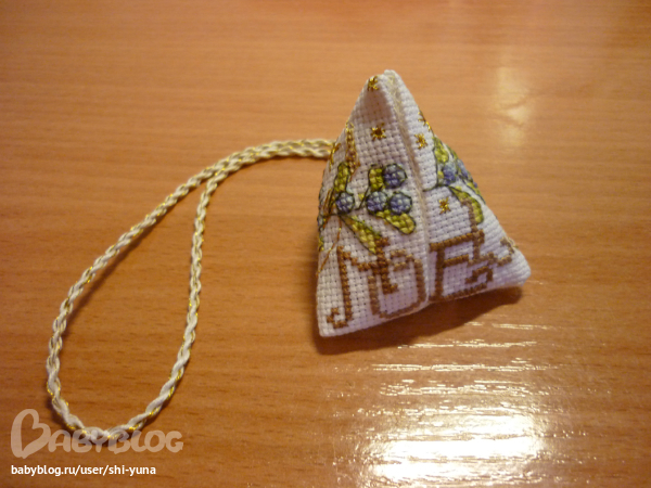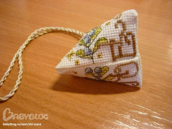В конце пути вкладываем шнурок, на котором будет висеть наша пирамидка. Хорошенько всё скрепляем и отрезаем нитку.