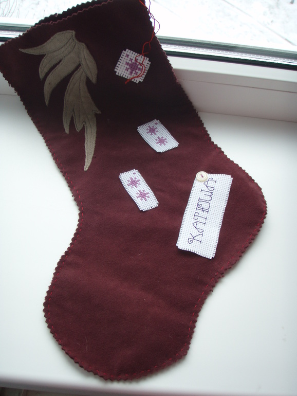 Девочки, всем привет. Не буду показывать павлинов, мало навышивала. ПОкажу только сапожок, который не получилось загрузить в прошлый раз. Напомню, что бисер, пайетки и имя вышивать будет хозяйка, мне надо было только вышить крестиком и бэк)вот такой сладенький девчачий сапожок получился