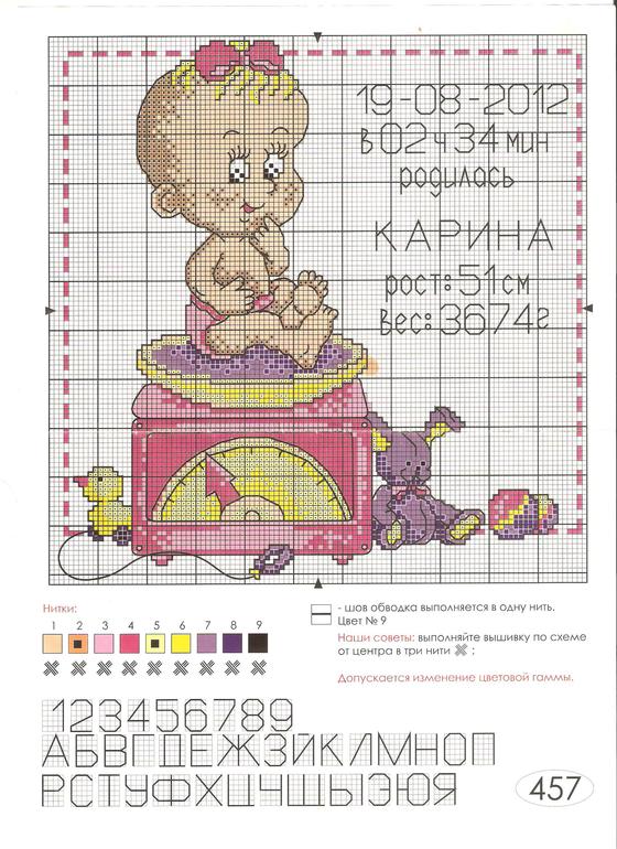 А я если честно вышивала на глаз и даже подбор не записала нигде((((А для девочки схему найти мне с большим трудом удалось! Все советовали просто у мальчика цвета на розовые поменять...