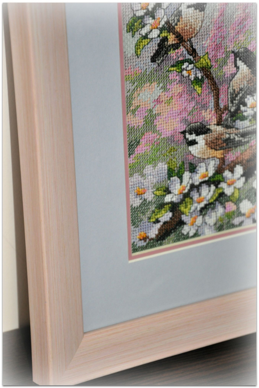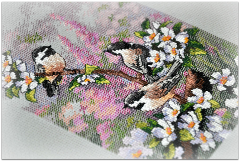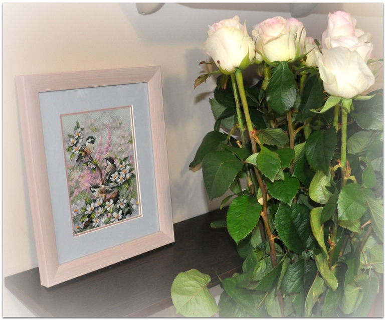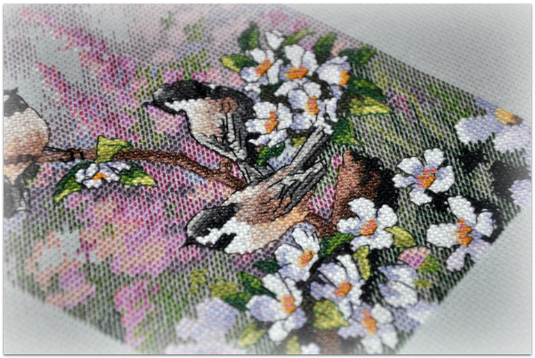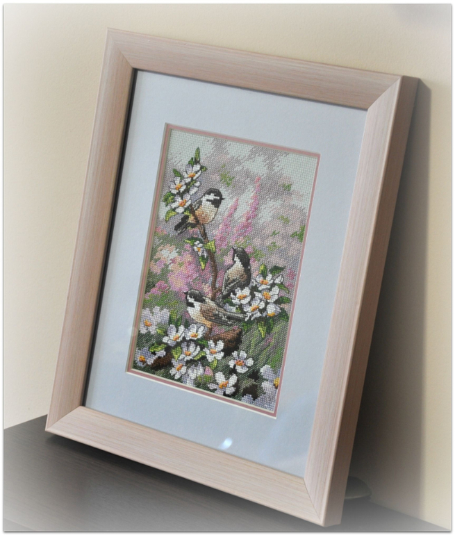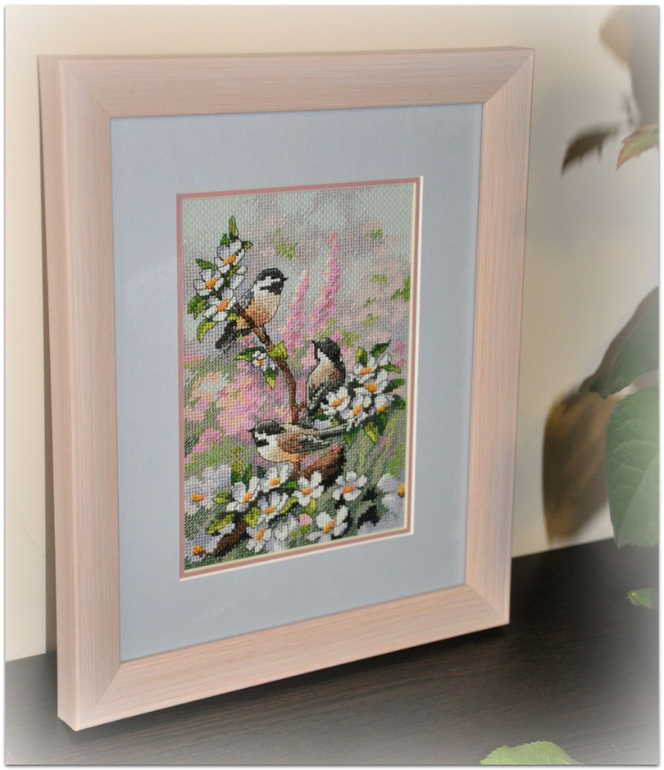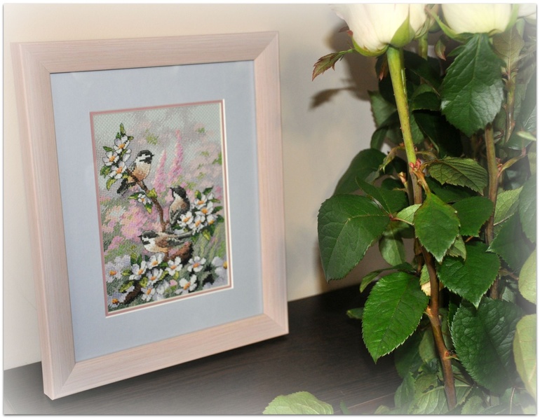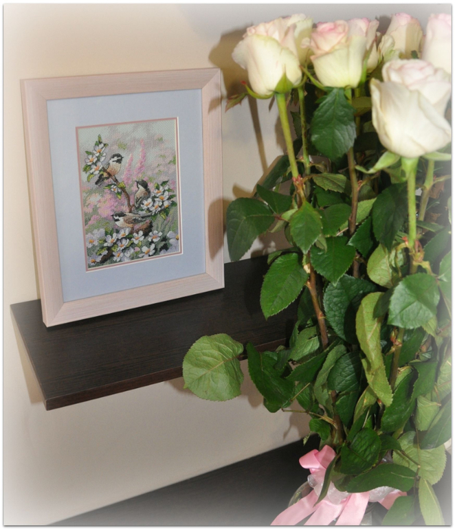 "Синички весной", набор Dimensions, размер вышивки 13*18 см, аида 16, серо-голубого цвета, счетный крест. В работе используются крест, полукрест, бэк, фрузелки. Набор вышивался легко и приятно :)