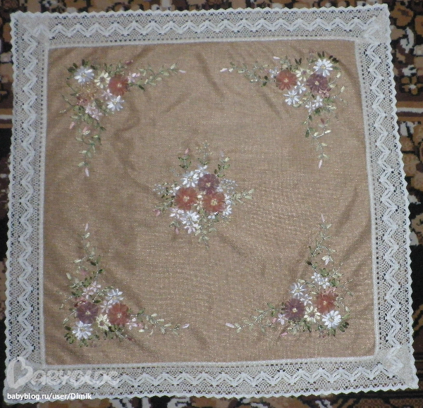 Какая красота! мне так захотелось научиться вышивать лентами и вышить скатерть... спасибо за вдохновение!))