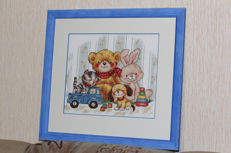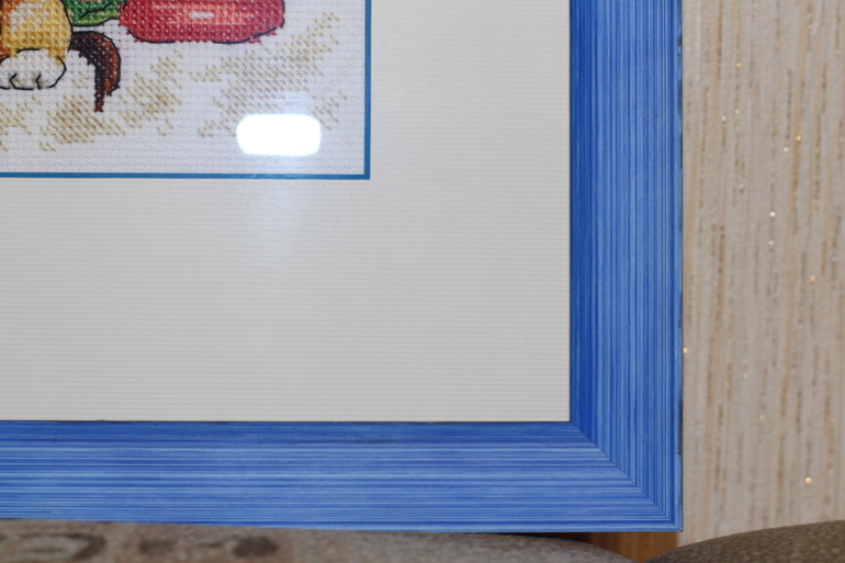 Верные друзья - багет дерево, паспарту одинарное, голубое в разрезе, стекло обычное. Офорлмением довольна.