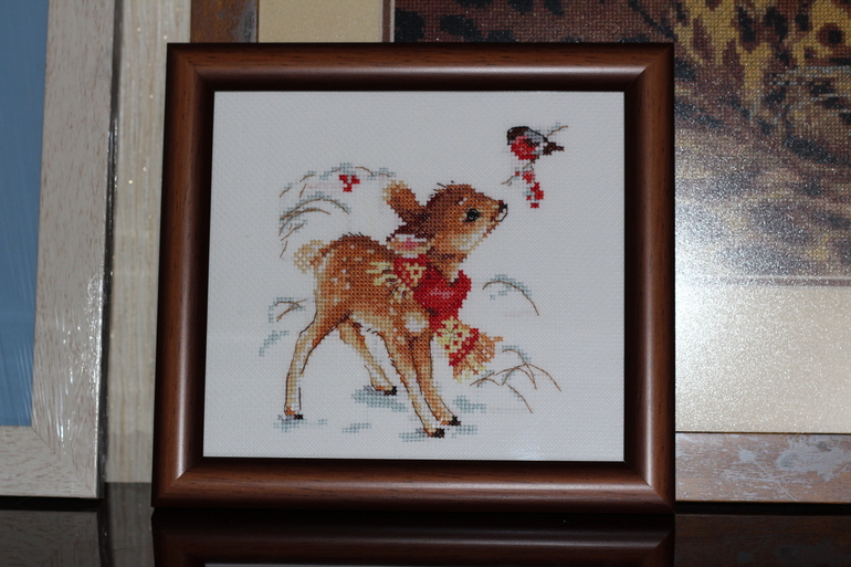 Олененок. Это работой вообще не довольна. Видимо, я неправильно объяснила. Сверху и по бокам я б немного срезала, чтоб получилась квадратная картинка. Слишком много пустоты по-моему. Олень ушел в подарок тете.